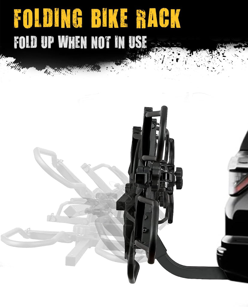 - Space-Saving Foldable & Tiltable Design - Easily assemble and mount this ebike rack on any 2" hitch receiver. Its folding design saves space when not in use, while the tiltable feature allows full access to your trunk, even with bikes loaded. (Note: Not compatible with swing-out tailgates.)