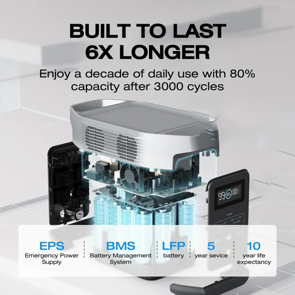 - Built to Last 6x Longer. Its LFP(LiFePO4) battery chemistry makes for a portable power station with a 3000+ cycle life. Enough for years on end of use. With a sophisticated BMS, you can go easy knowing its auto-regulating to keep you safe.
