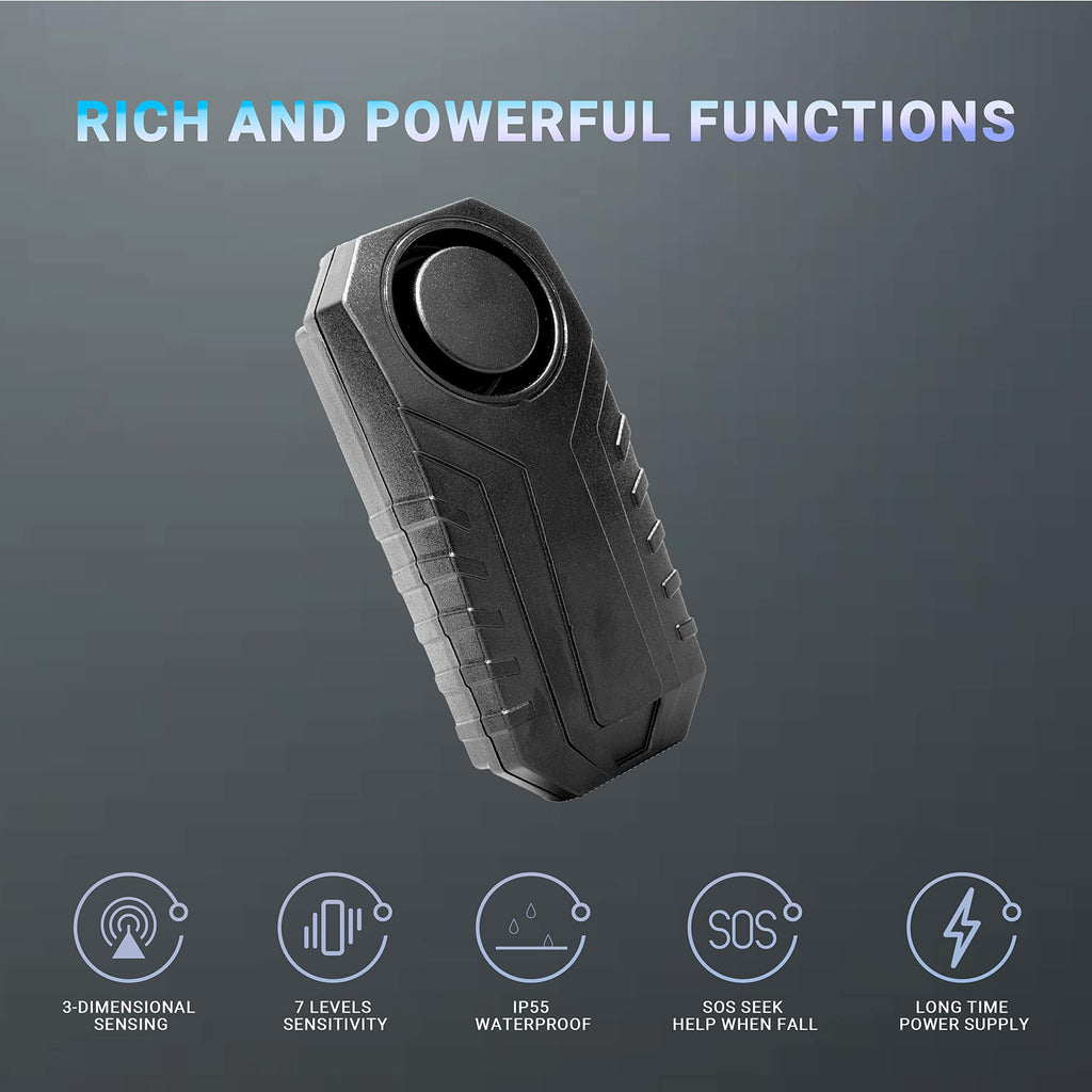 - SUPER LOUD & ADJUSTABLE SENSITIVITY: The newly upgraded three-dimensional displacement sensor and algorithm are used to accurately identify theft. Anti-theft bike alarm has 6 alarm sounds of car grade and up to 113dB loud vibration alarm, scare off potential thieves effectively and attract people's attention. The 3 adjustable volume and 7 levels of sensitivity adjustable from gently touch to push or beat, you can be easily set according to your needs.