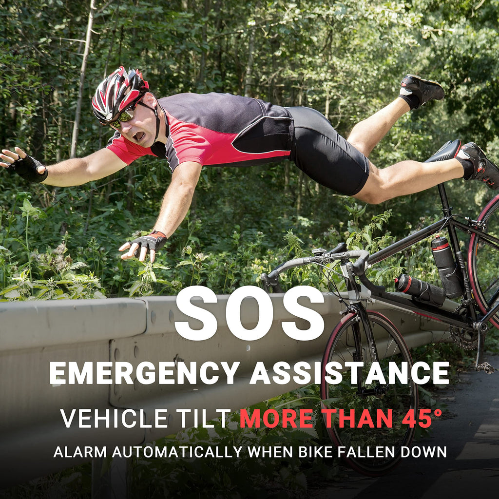 - VIBRATION SENSOR AND SOS ALARM: When armed, this anti-theft bicycle alarm responds to vibration or being moved. Anti-theft alarm triggered by vibration, can help to deter thieves effectively, provide additional security and give you peace of mind. Alarm and horn 2 in 1 feature functions, affordable and practical bike accessories. SOS function will detect an accident if the vehicle is tilted more than 45° from its original position, and then make a beeping sound to signal for help.